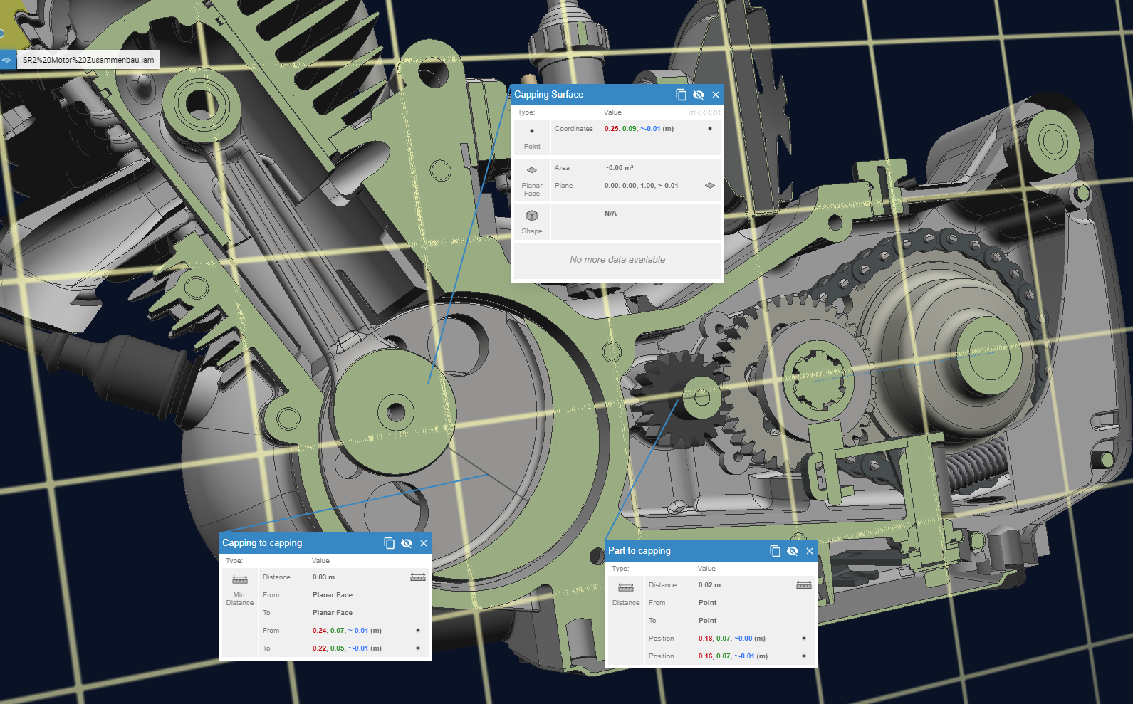 Measurements can be also performed on capping surfaces. It can be applied to both between two capping surfaces or between one capping surface and a part of the model.